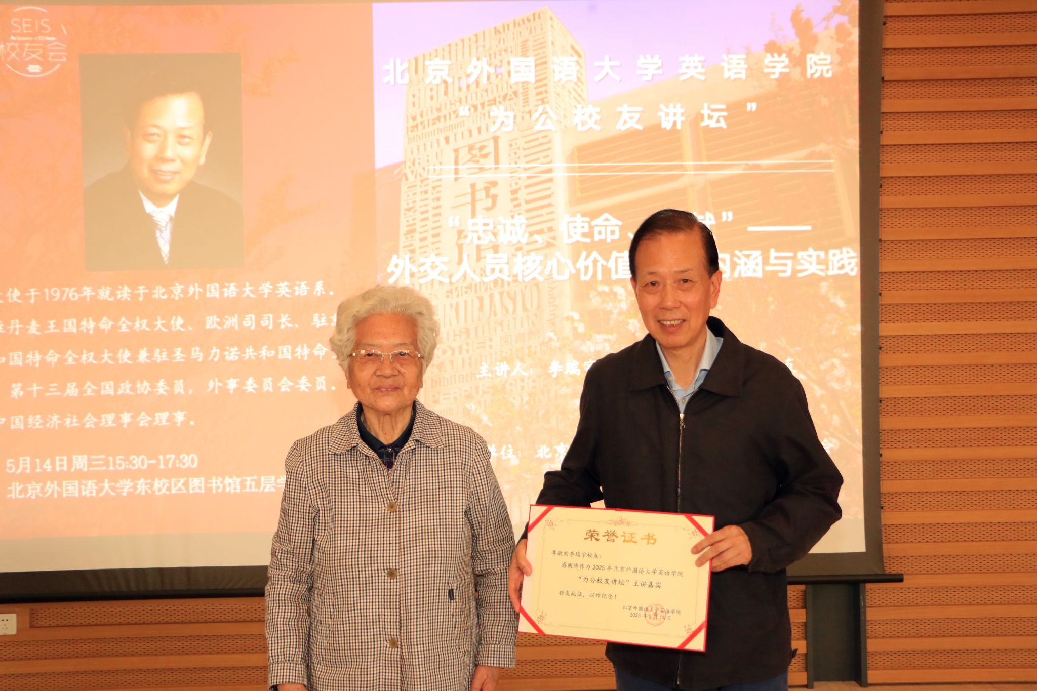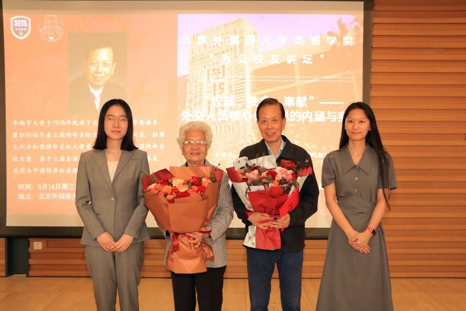 讲座最后,陈乃芳为李大使颁发了为公校友讲坛证书,现场同学为两位前辈献上鲜花并合影留念。