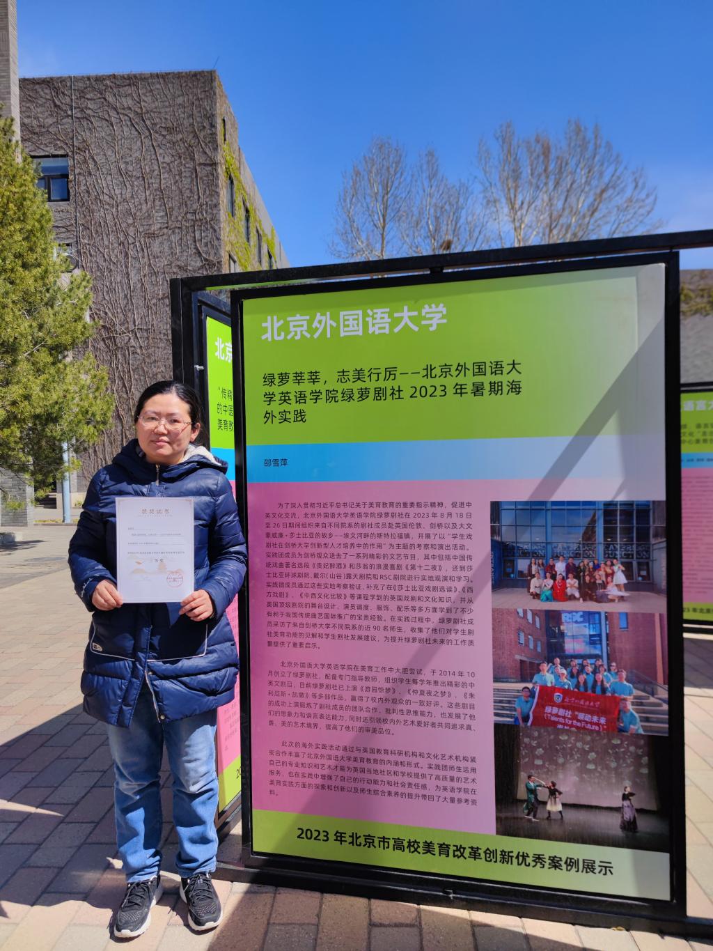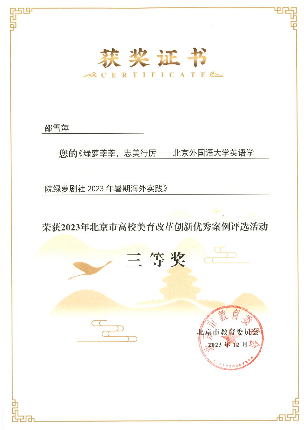 绿萝剧社2023年暑期海外实践》,该项目获得2023年北京市美育改革创新优秀案例三等奖。