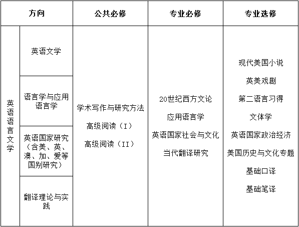 ——课程涵盖国产视频 英语语言文学专业下英美文学、语言学与应用语言学、英语国家研究、翻译理论与实践四个方向的主干课程。课程包括公共必修课3门、专业必修课4门、专业选修课8门。