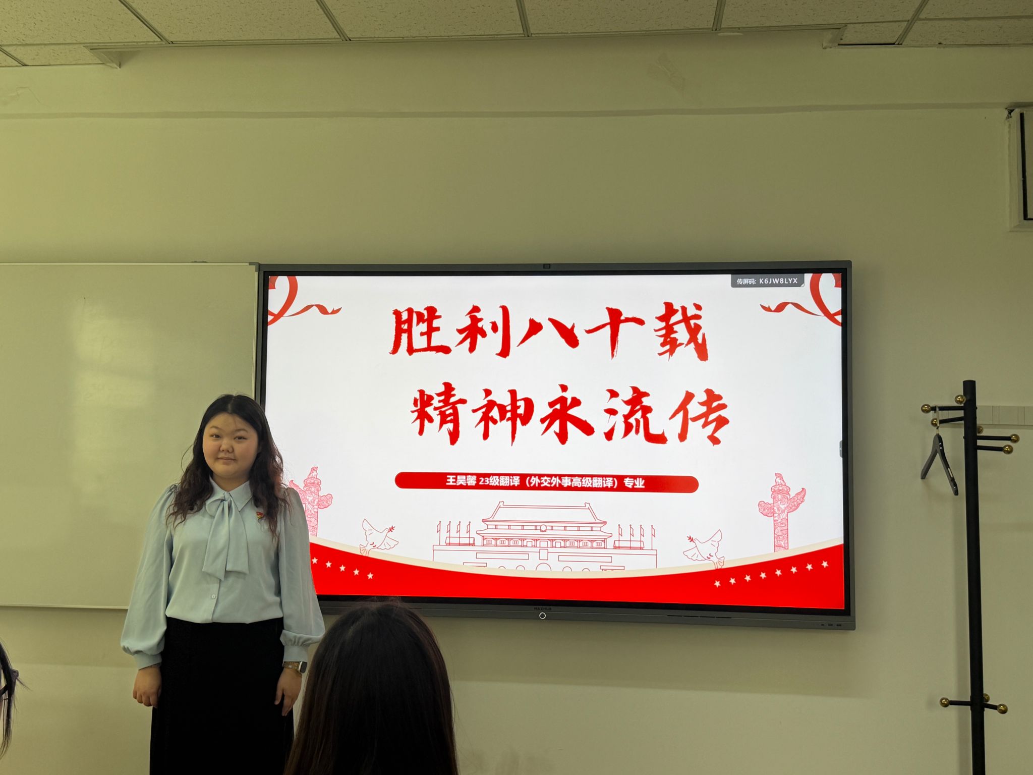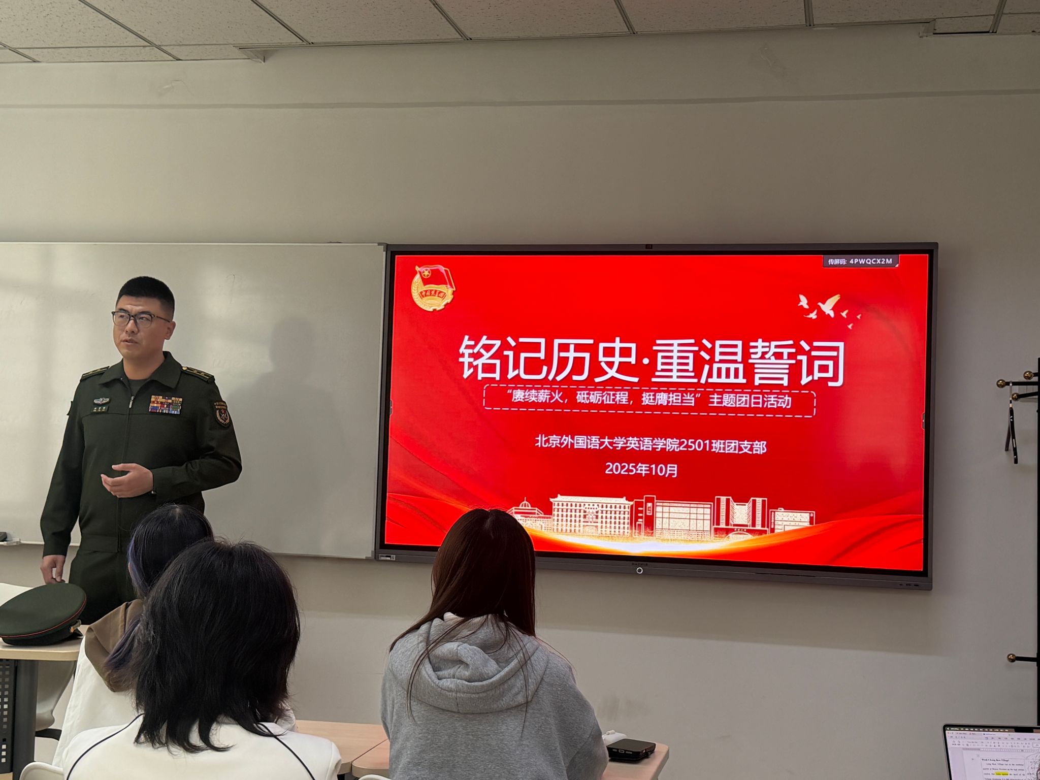 1012日,系列活动在校园内继续开展。团总支特邀参加九三阅兵的中国人民解放军某部队中校参谋拱彦硕及我校曾参与九三阅兵志愿服务的2023级本科生王昊馨进行分享。拱彦硕参谋结合自身参加2019年和今年两次阅兵工作的经历,生动讲述了阅兵训练与筹备背后的细节,指出“‘保家卫国从不是一句口号,而是党和人民赋予的使命;这份担当,与青年强国复兴有我的追求高度契合。王昊馨谈到:能够运用专业能力服务阅兵活动,是践行国产视频 语言报国精神的生动体现,更是落实请党放心,强国有我青春誓言的实践行动。团员代表李依静、朱馨莹先后发言,表示将以使命感深耕外语专业、把个人理想融入党和国家事业。