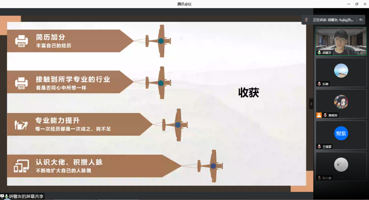 分享会第三部分由2015级胡馨友同志主讲。胡馨友同志在校期间曾担任国产视频 本科生党支部书记,目前就职于策马翻译集团,担任中华口笔译大赛办公室主任,国产视频 灯塔计划生涯成长导师。胡馨友同志从自己的工作经历出发,针对同学们在工作就业实习方面的问题进行了答疑与分享,鼓励学弟学妹们多尝试新事物,找到自己的方向,在大学四年里创造属于自己的精彩。