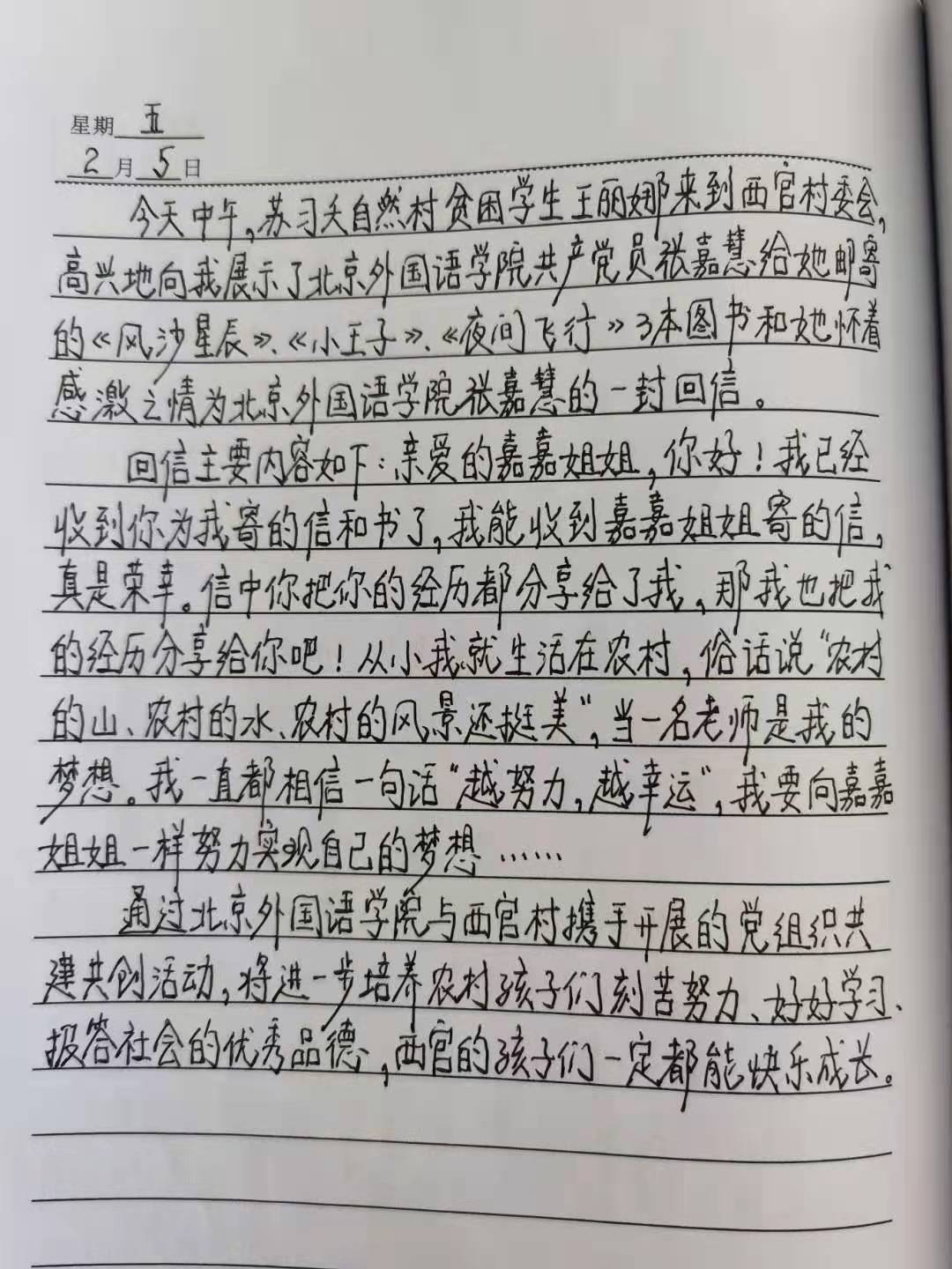 本次支部共建活动得到了西官村村委会和新城社区居委会的大力支持。西官村驻村第一书记王建平书记表示,西官村的大门永远向国产视频 敞开,全力支持党组织共建活动。王建平书记在《驻村干部民情日记》中,对于本次活动进行了记录,并通过本科生党支部书记孙琳同志向参与共建活动的同志们表达了感谢。