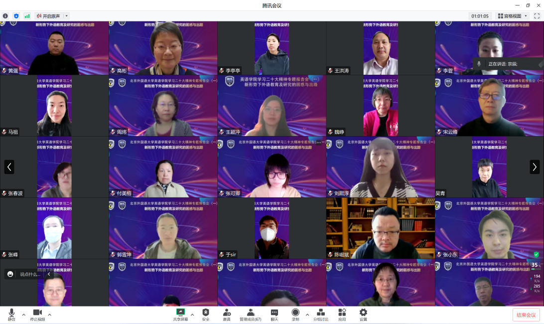 副院长张莲在总结中提到,杨枫教授关于外语教育与研究中的国家意识、学术话语与国家话语的隔离以及新技术带来的冲击的观点阐释全面概括了新时代外语教育理论与实践创新发展所面临的困惑,立意高远,视野开阔,富有启发。作为语言使用者、实践者和研究者,我们必须将语言、语言使用和语言教育和我们的时代,我们现实生活紧密联系起来,方能解读好现实,服务国家和社会发展的需求。