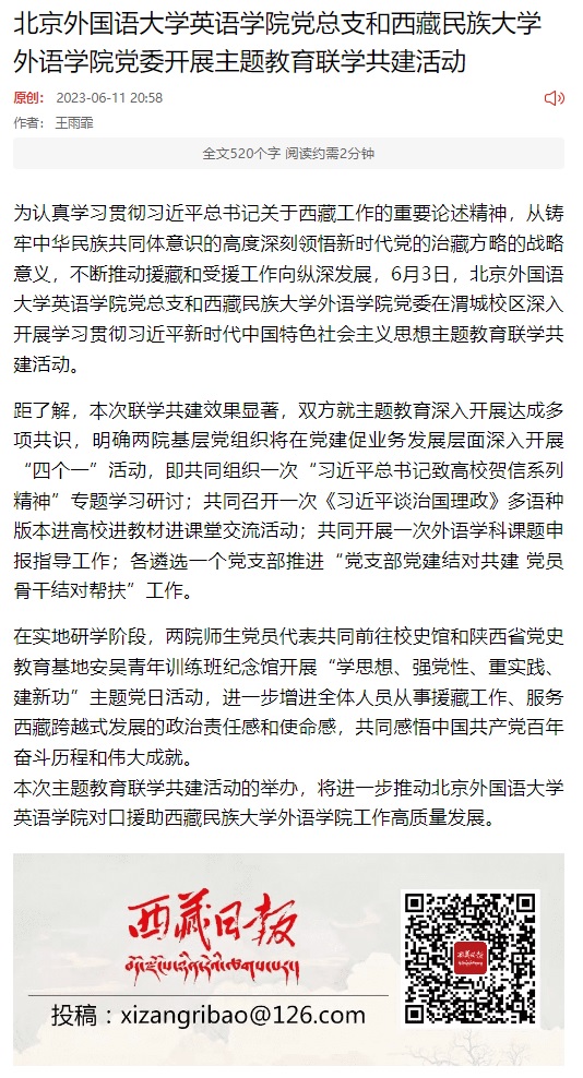 党总支与西藏民族大学外语学院党委主题教育联学共建活动。