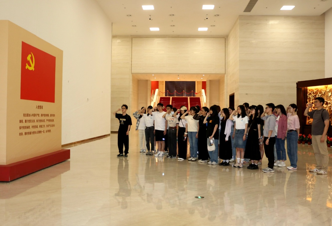 参观结束,党员师生站在一面鲜艳的五星红旗前,举行宣誓活动,重温入党誓词。