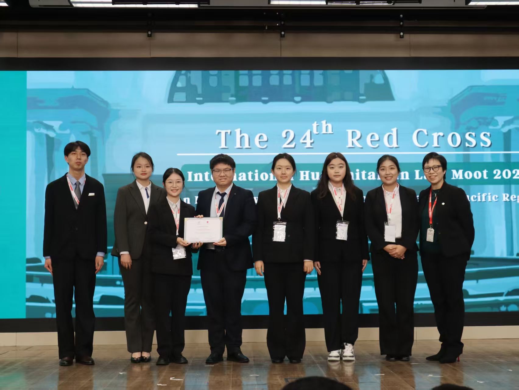 英语(中国政法大学联合培养涉外法治人才)专业2023级本科生邹一鸣与法学院4名同学组成的代表队,在法学院付姝菊老师、法学院2022级本科生邱嘉欣的指导下荣获亚太地区四强,创造了我校代表队参与红十字国际人道法模拟法庭竞赛的最好成绩。