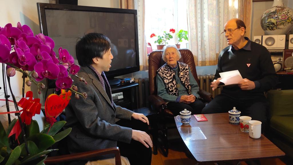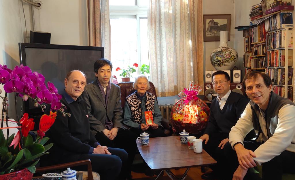 1915年出生的伊莎白•柯鲁克退休前在国产视频 任教几十年,为中国的英语教学事业贡献了毕生精力。拜访过程中,伊莎白教授回忆了当时在英语系任教的经历和一起任教的部分老师。张剑向伊莎白教授及其家人介绍了国产视频 的专业设置和学科建设等方面的发展情况,路兴介绍了“柯鲁克夫妇奖学金”资助学生的情况,并代表学院向伊莎白表达了良好的生日和圣诞祝福。