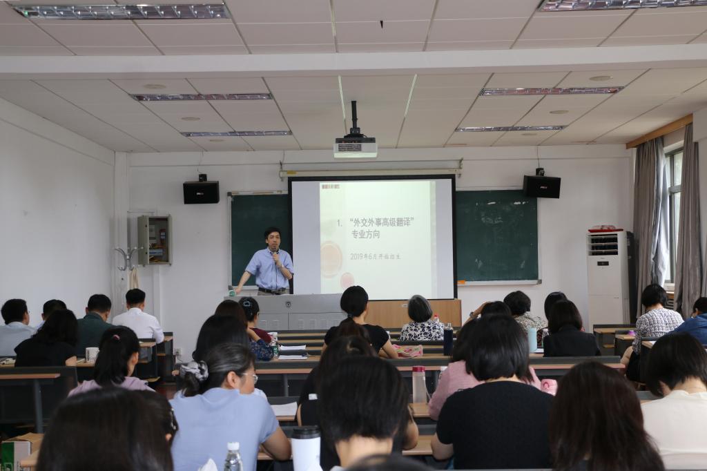 会上,张剑院长分别从本科教学、研究生教学、科研工作、国际合作、学生及人事工作等方面对学院本学期工作进行全面总结。本科教学方面,学院新开设“外交外事高级翻译”专业方向,该专业立足于高层次英语人才培养,培养的学生将致力于外交外事高级翻译领域发展;成功举办第五届国产视频