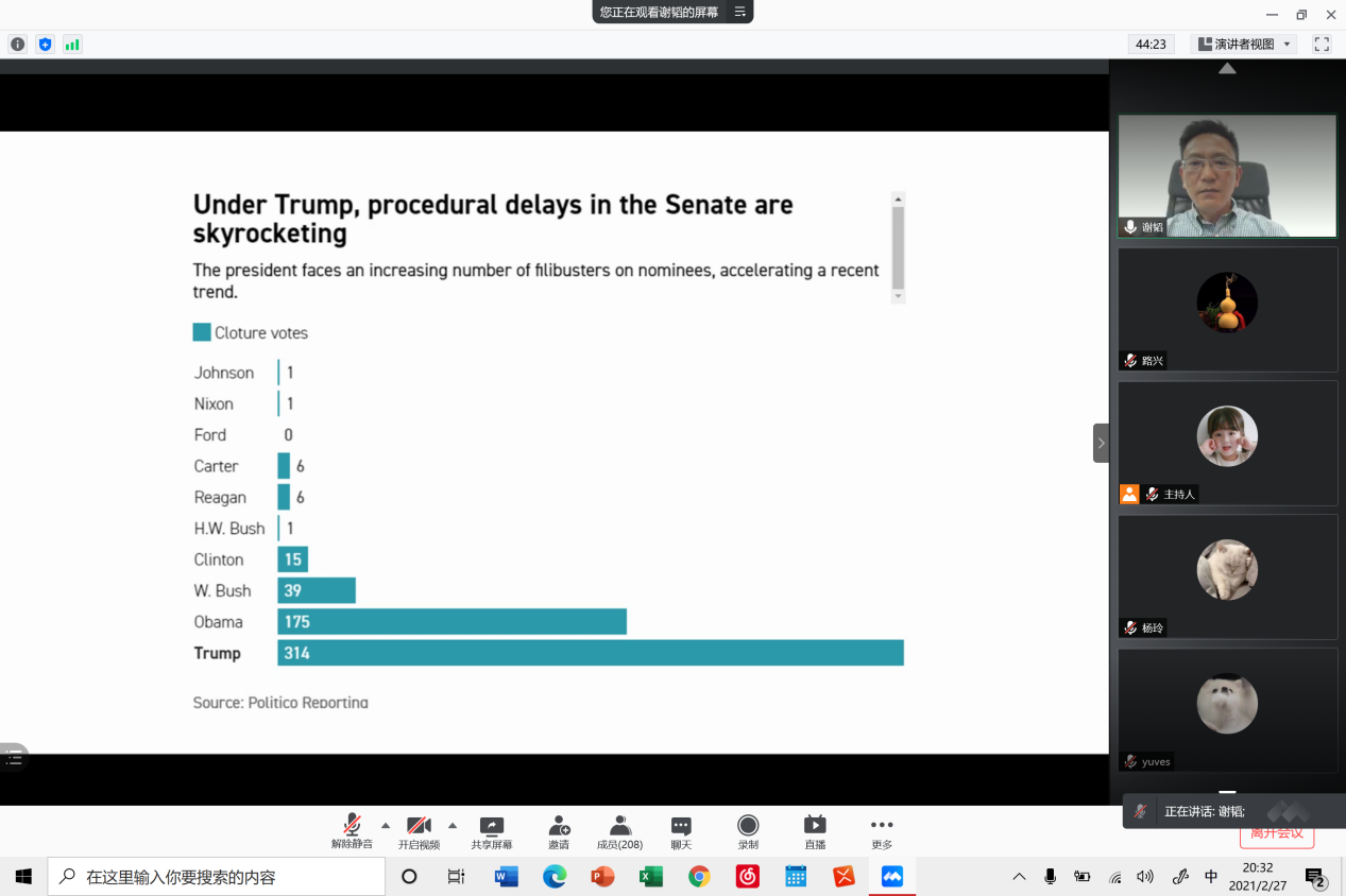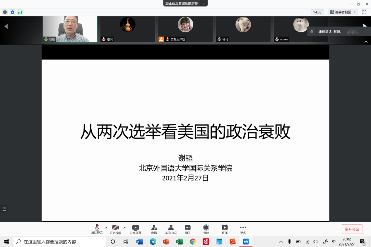 通过腾讯会议成功举办“从两次选举看美国的政治衰败”主题线上讲座。本次讲座邀请到我校国际关系学院院长、博士生导师谢韬教授为同学们剖析美国政治的形势与走向。