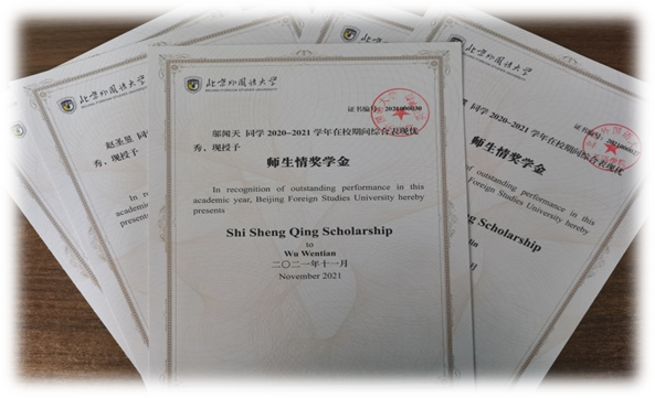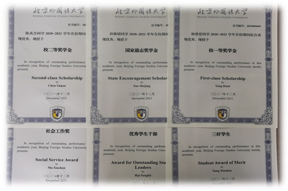 杨依云、陈清宇、卢洁、史欣怡、肖岚杰、邓语嫣、廖雨婷等同学,分别在全国大学生英语辩论赛、全国英语演讲大赛总决赛、《习近平谈治国理政》多语种版本进高校进教材进课堂试点工作“英语口译大赛”、北京市大学生英语演讲比赛、第十届全国口译大赛以及第二届“诗译中国”全国高校双语文创大赛中,获得殊荣。