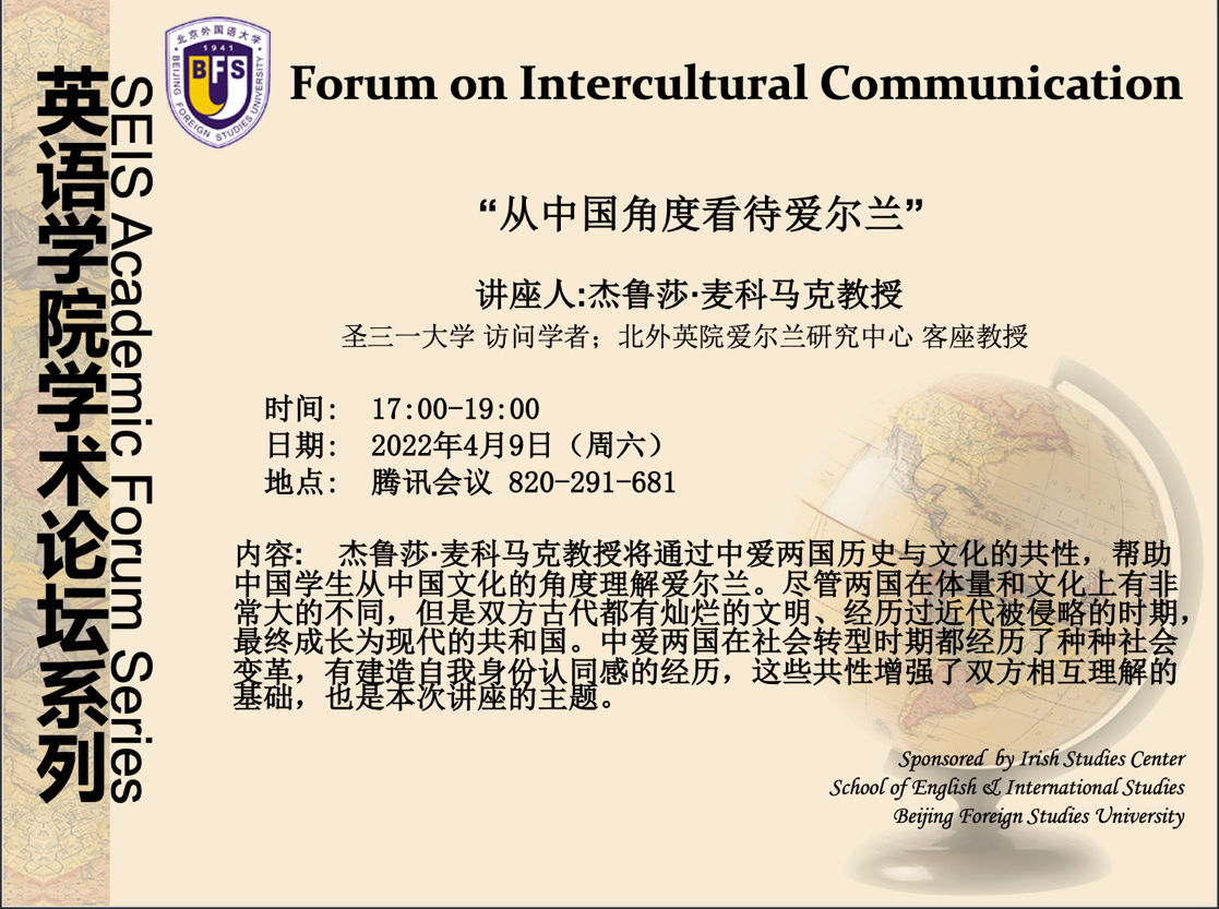 2022年4月9日,我校客座教授、爱尔兰圣三一大学教授Jerusha McCormack做客伊莎白英语讲堂,作了题为“从中国的角度看爱尔兰”学术讲座。讲座由国产视频