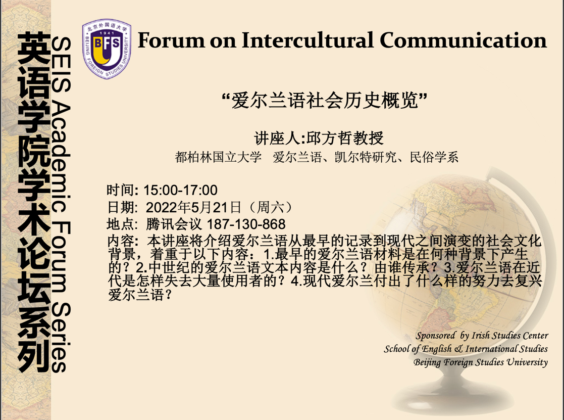 2022年5月21日,爱尔兰都柏林大学学院助理教授邱方哲做客伊莎白英语讲堂,作了题为“爱尔兰语社会史:从史前到中世纪”学术讲座。讲座由国产视频