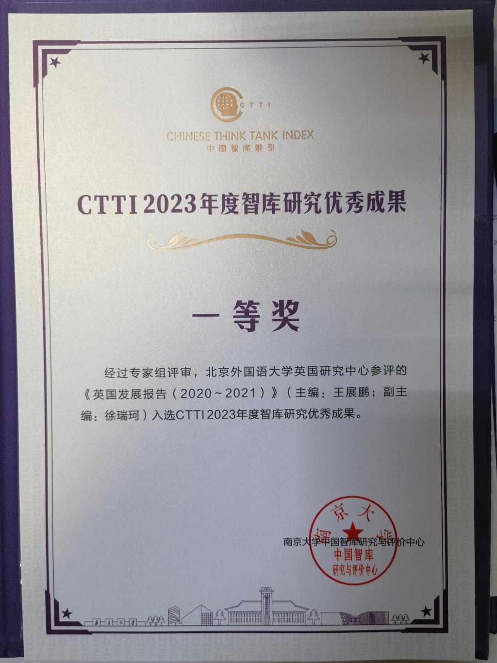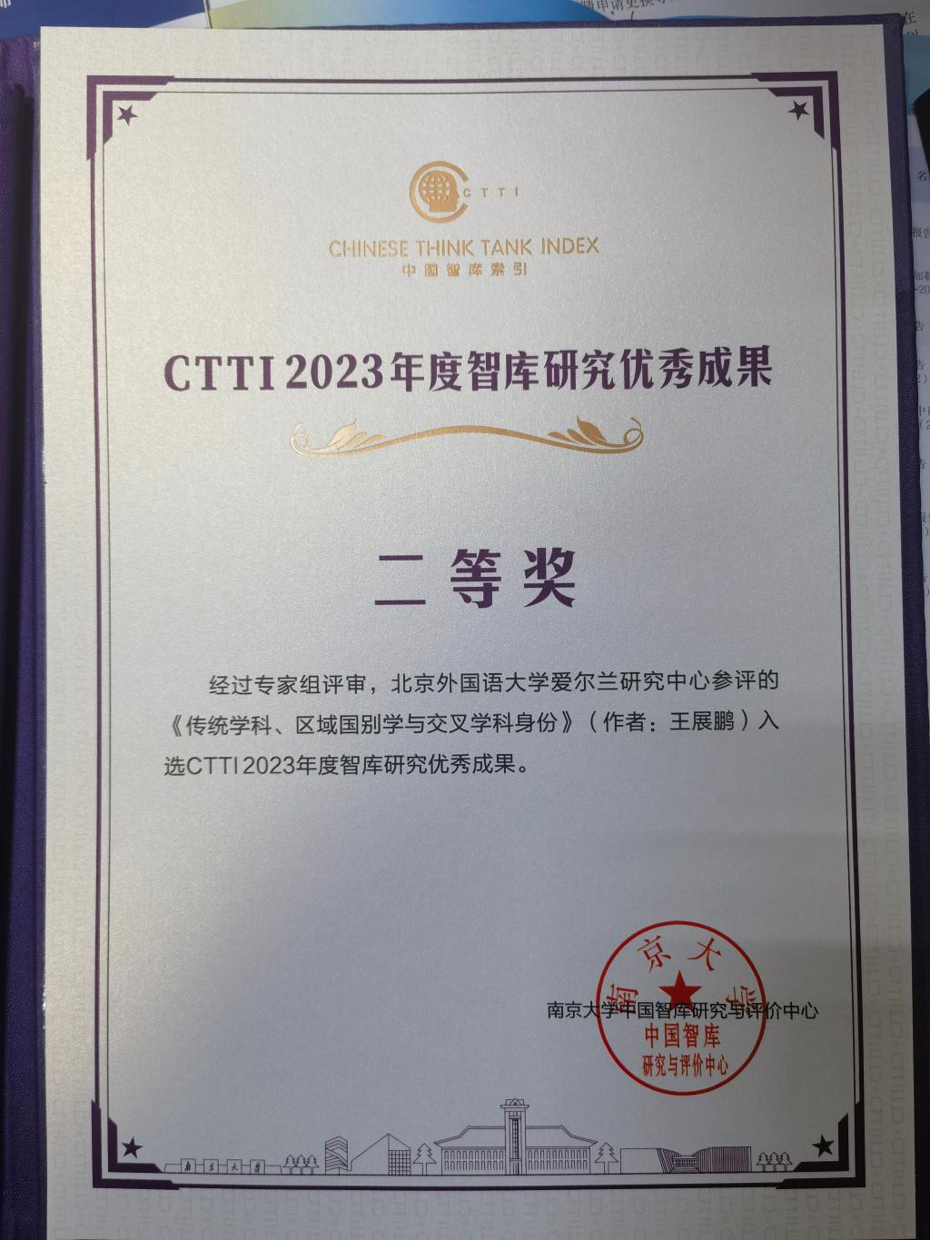英国研究中心参评的《英国发展报告(2020-2021)》(主编:王展鹏;副主编:徐瑞珂)获得CTTI2023年智库研究优秀成果一等奖;爱尔兰研究中心参评的论文(王展鹏,《传统学科、区域国别学与交叉学科身份》,载《国际论坛》2022年第6期)获得CTTI2023年智库研究优秀成果二等奖。