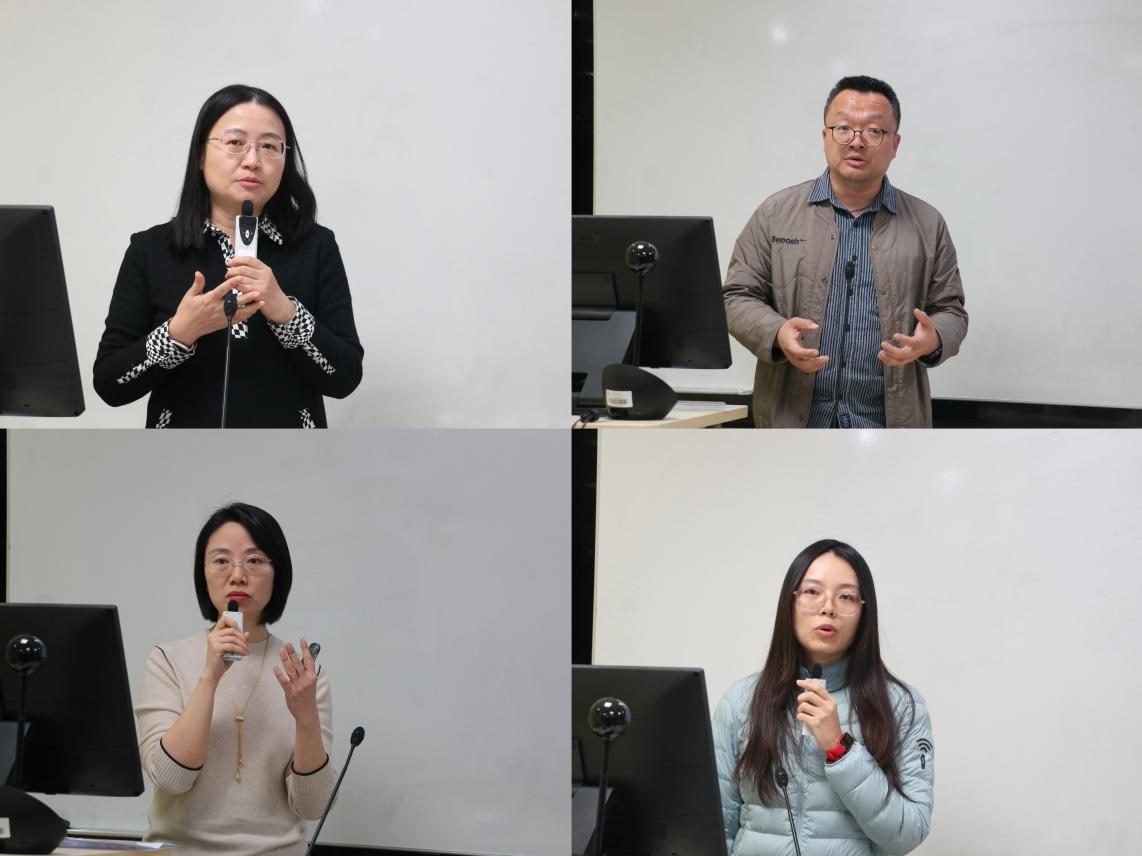 教师代表进行专题发言。杨鲁新以“数字赋能的英语叙事文写作教学实践”为题向在座老师系统展示了如何运用企业微信、iWrite系统开展叙事文教学工作,从而充分激发学生能动性和同伴交流,促进个性化学习,推动精准化教学,减轻教师工作量,取得人机协同教学1+1>2的成效。陈崛斌以“理解与思辨:在跨文化思辨中讲好中国故事:《大学思辨英语精读4:哲学与文明》《理解当代中国读写教程》融合教学设计”为题介绍了课程融合设计的思路和方法、展现融合教学成果、并提出下一步改进和落实方案,陈老师的分享为理解当代中国课程建设提供了有益借鉴。周杜娟以“珠联璧合、相得益彰:如何让公共演讲课和演讲队培训相辅相成共同助力高素质人才培养和教学质量提升”为题介绍了公共演讲课的创新特色以及演讲队人才培养机制,阐释如何充分发挥将二者有机结合产生的1+1>2的协同作用,从而实现培养出色演讲选手、提升演讲课教学质量、贯彻“理解当代中国”思想的目标。王颖冲以“理解当代中国,讲好中国故事:翻译教学与课程思政”为题阐释通过翻译实践课程来加强文化载体建设,提高学生用外语言说中国的能力,从“理解当代中国”到“讲好中国故事”。如何在“知己”和“知彼”中培养有“政治站位、工匠精神、外语功底、翻译能力、技术素养”的译者。