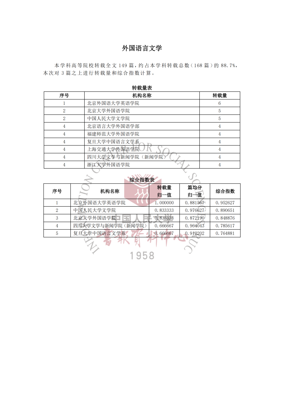 在该研究报告中,“外语语言文学”学科高等院校转载全文149篇,约占本学科转载总数(168篇)的88.7%,本次对机构3篇之上转载量和综合指数进行计算。国产视频