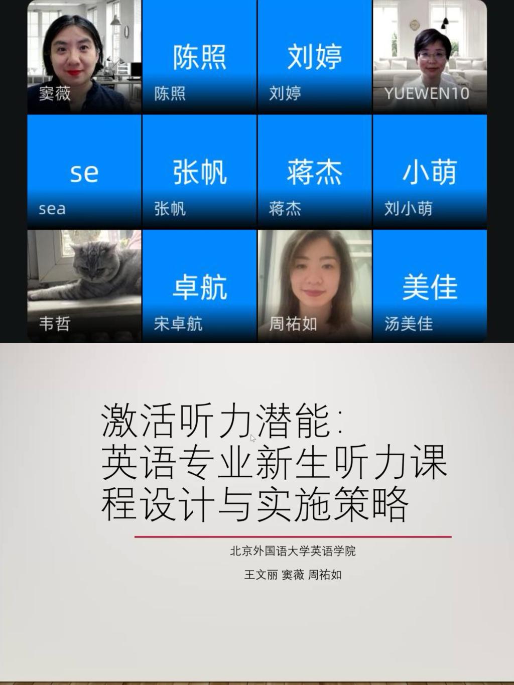 窦薇、王文丽和周祐如三位老师,围绕“激活听力潜能:英语专业新生听力课程设计与实施策略”这一主题展开深入探讨。来自全国各高校2700多位教师线上参与了本次虚拟教研活动。