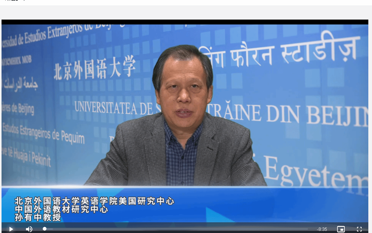 原副校长、美国研究中心孙有中教授在视频致辞中热情地回顾了由张之香大使(Ambassador Julia Chang Bloch)创建的中美教育基金和美国研究联络会通过举办相关活动,推进中国的美国研究和中美人文、教育交流的光辉历程。孙教授还指出,在中美竞争加剧的背景下,中美教育基金和国产视频