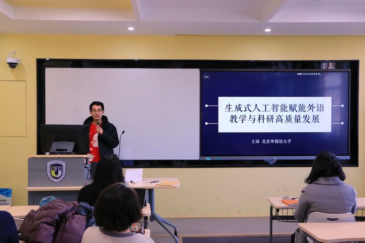 人工智能与人类语言重点实验室王琦博士以“生成式人工智能赋能外语教学与科研高质量发展”为题,作发言报告。从生成式人工智能入手,讲述了大语言模型的发展变革。提出传统外语教学面临一定的问题与挑战,人工智能能够在很大程度上赋能外语教学与研究,并通过演示范例生动形象地讲解了如何通过人工智能辅助教学、优化教学。