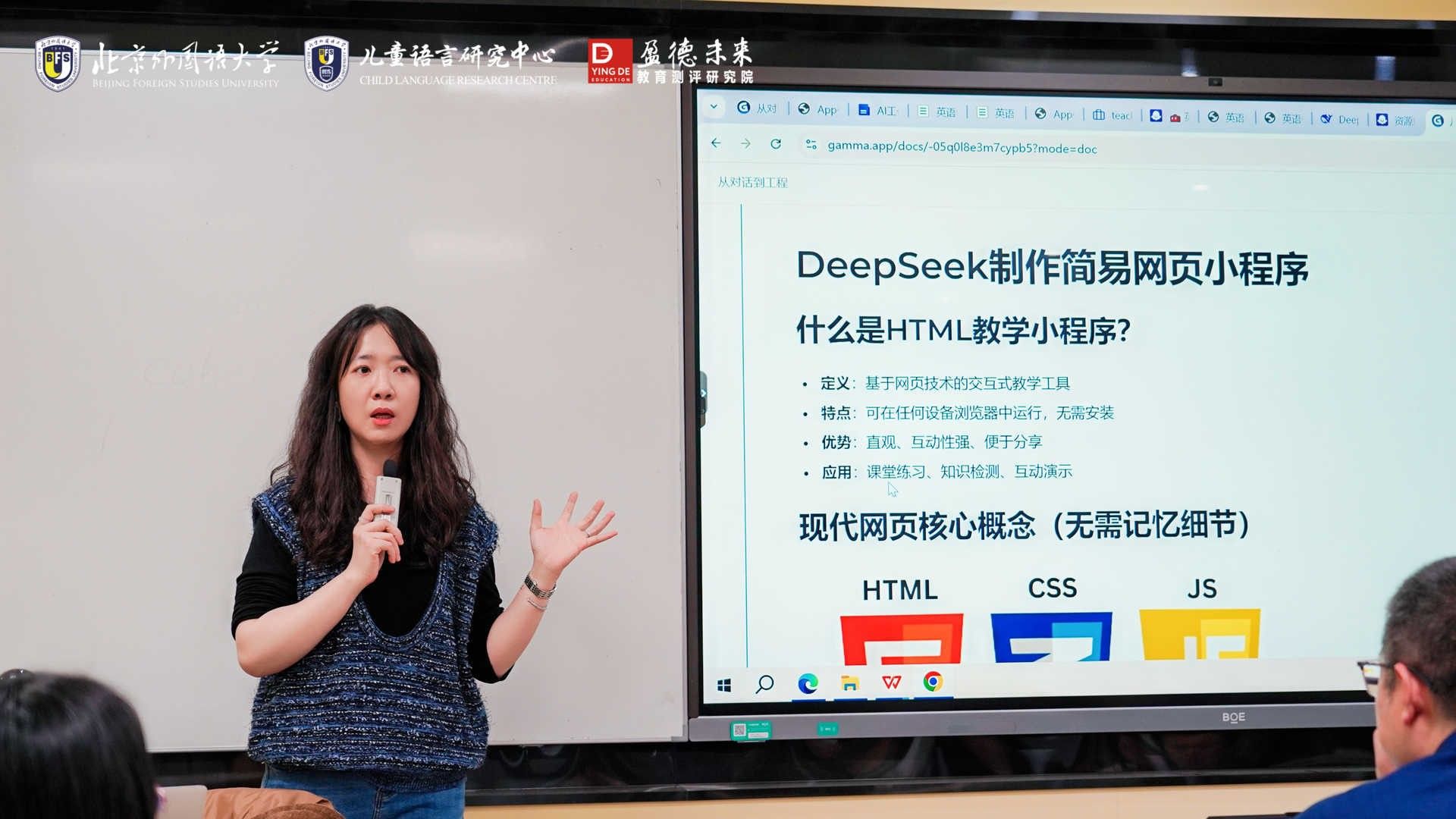 讲师刘梦博士在工作坊中分享了AI辅助英语教学的新思维,展示了如何利用AI工具系统性地提升教学效果,并带领教师们进行能够举一反三的实操,帮助教师从AI技术的碎⽚化应⽤向系统化设计转型。
