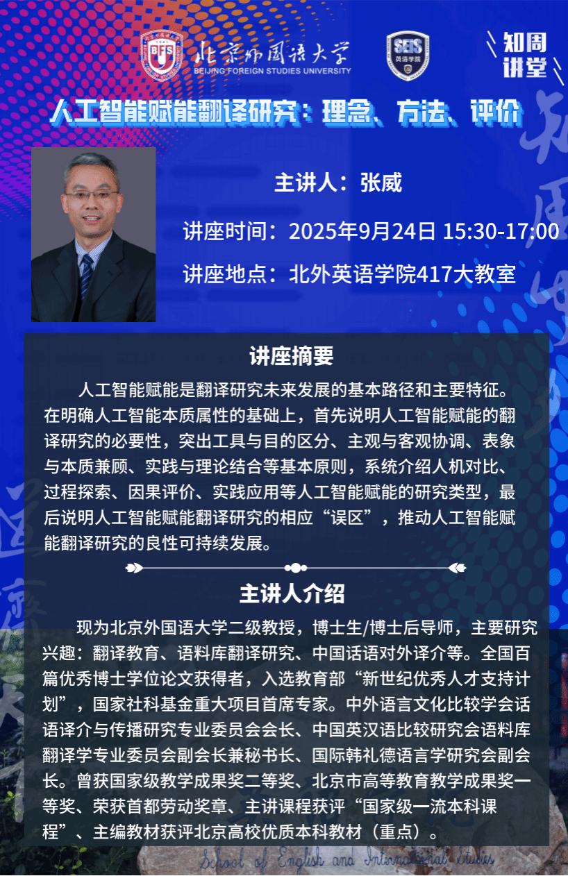 二级教授,博士生/博士后导师,主要研究兴趣:翻译教育、语料库翻译研究、中国话语对外译介等。全国百篇优秀博士学位论文获得者,入选教育部“新世纪优秀人才支持计划”,国家社科基金重大项目首席专家。中外语言文化比较学会话语译介与传播研究专业委员会会长、中国英汉语比较研究会语料库翻译学专业委员会副会长兼秘书长、国际韩礼德语言学研究会副会长。曾获国家级教学成果奖二等奖、北京市高等教育教学成果奖一等奖、荣获首都劳动奖章、主讲课程获评“国家级一流本科课程”、主编教材获评北京高校优质本科教材(重点)。