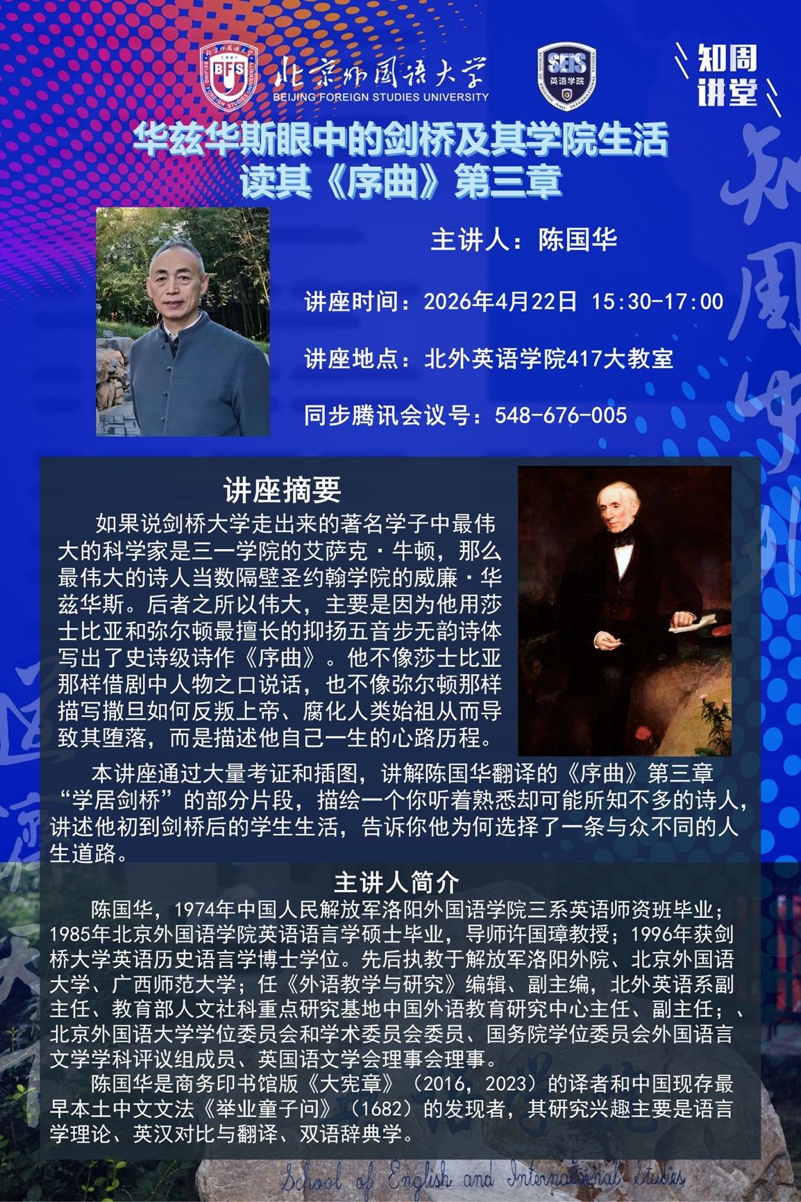4月22日讲座:华兹华斯眼中的剑桥及其学院生活——读其《序曲》第三章