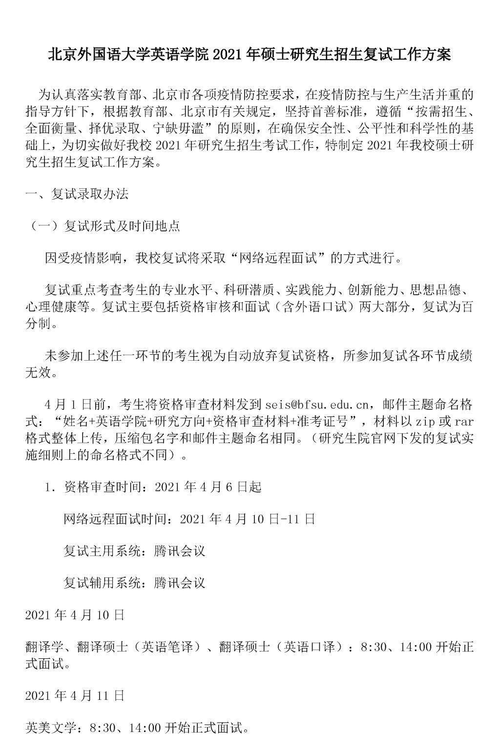 2021年硕士研究生招生复试工作方案
