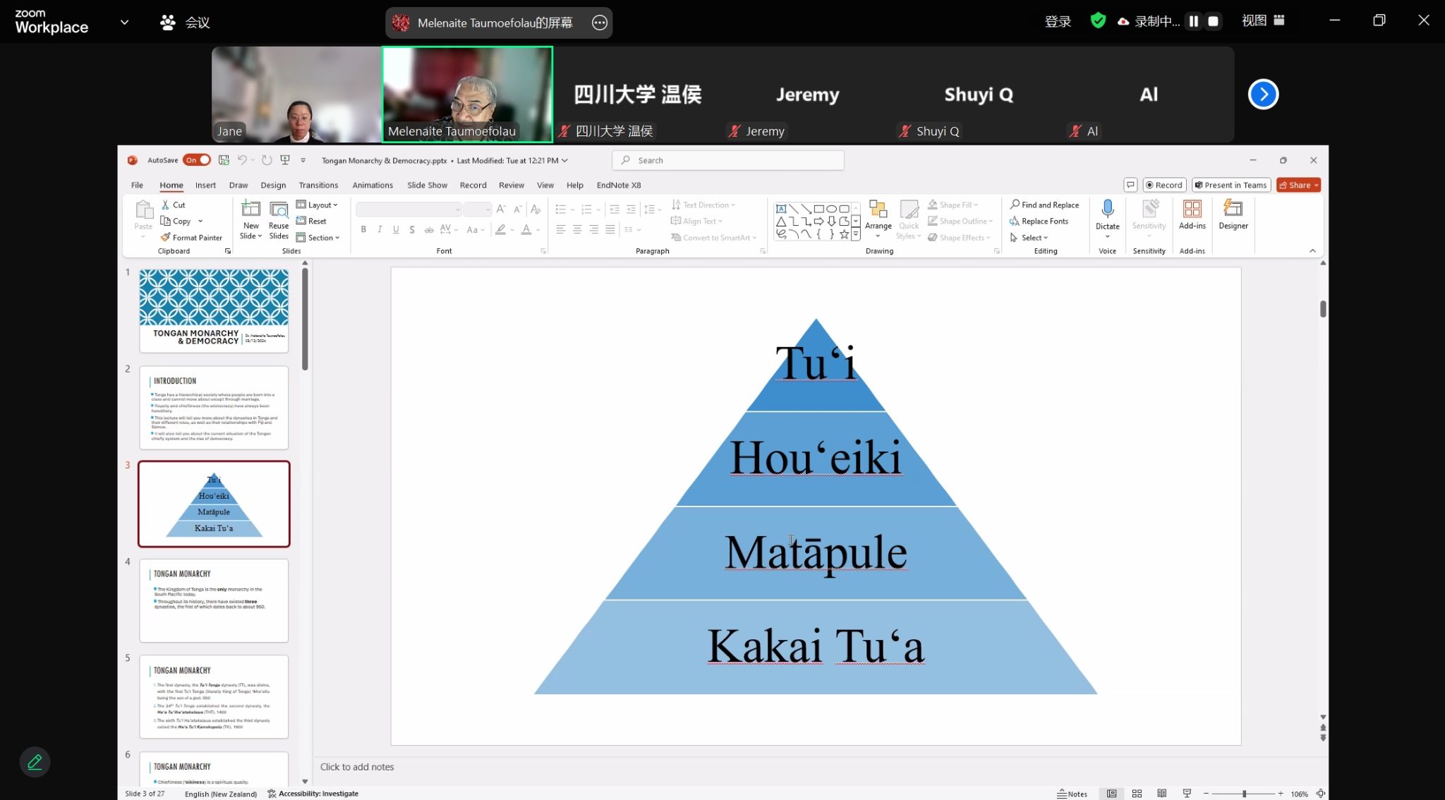 南太平洋研究中心邀请,汤加语外国专家梅莱奈伊特·塔乌莫艾富拉乌(Melenaite Taumoefolau)博士在线上做了题为“汤加王朝的变迁”(Tongan Monarchy and Democracy)的讲座。讲座由国产视频