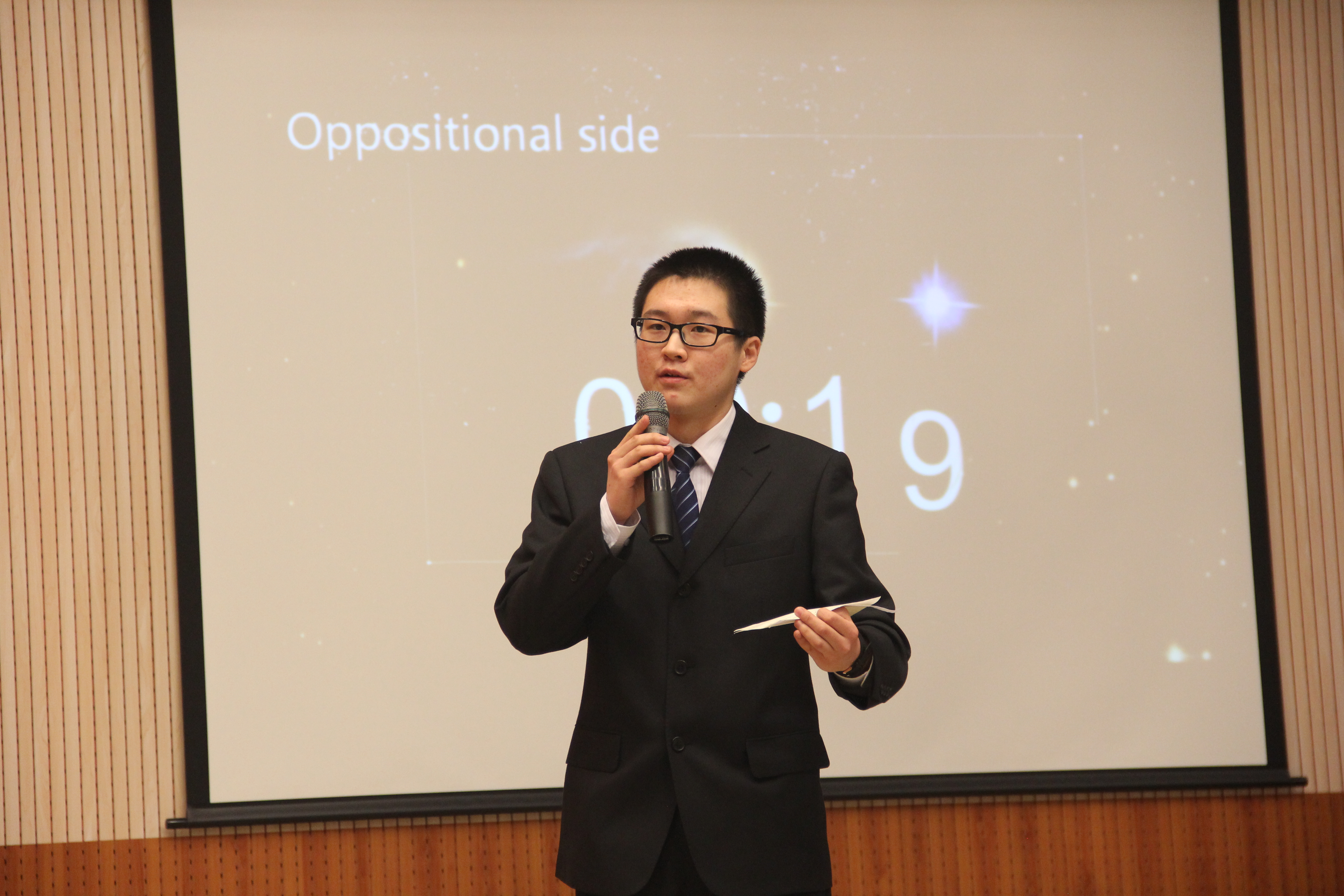 ——本次比赛包括自备演讲和辩论两个环节。在第一环节中,七位选手对“The Crowd”这一主题进行了不同的阐释。在比赛过程中,参赛选手们沉着自信,观点新颖,见解独到。其中,3号选手黄扬的表现令人印象深刻。她就“Cyberbully”这一切入点阐述了“多数即正确的潜意识造成了人群的不理智”这一观点。在演讲过程中,她的肢体语言和口语表达配合完美,同时也紧紧吸引了观众的注意力。