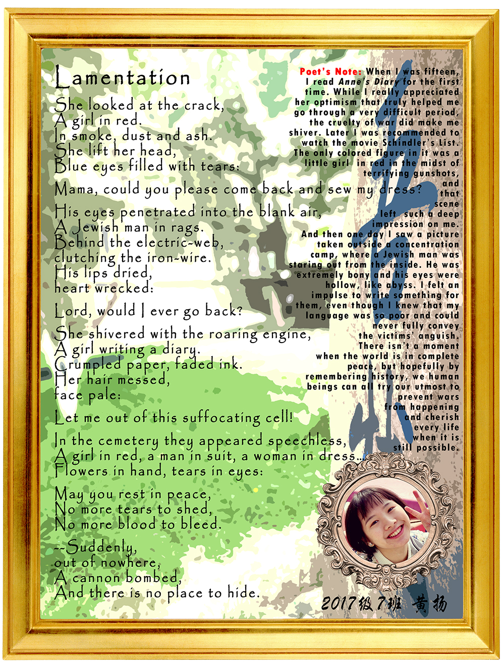 ——2018年春季学期,为丰富教学内容及激发学生学习兴趣,“英语批判性阅读(精读)2:文学与人生”课程教研组依托教材相关内容,组织学院2017级共7个班所有本科学生开展了“英文诗歌创作”活动,同学们积极参与,均提交了优秀作品,经过同学间相互赏读和评议,甄选出最受欢迎的21首英文诗歌作品,特此展示。此次活动中,同学们展现出高涨的热情、非凡的创造力、丰富的情感知识、健康的审美情趣、深刻的生活感悟,以及优秀的英文书面表达能力。