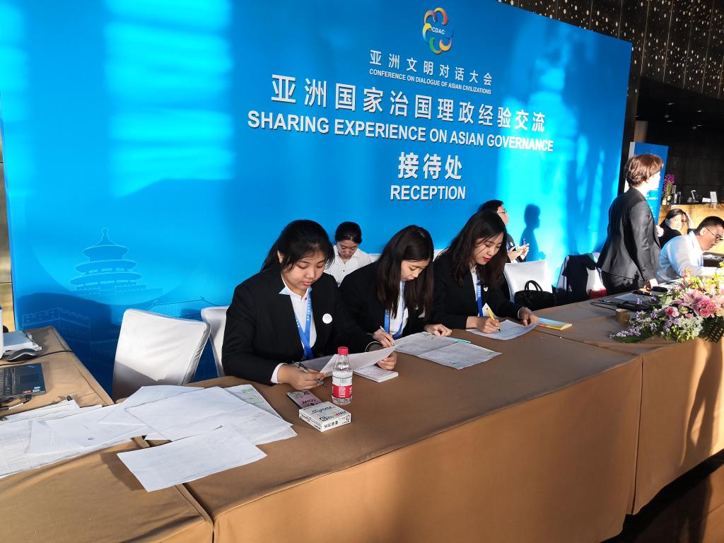 2017级研究生武盼盼、黄增作为外宾陪同志愿者,2015级本科生王博铮担任日常引导服务志愿者参加亚洲文明志愿者大会。