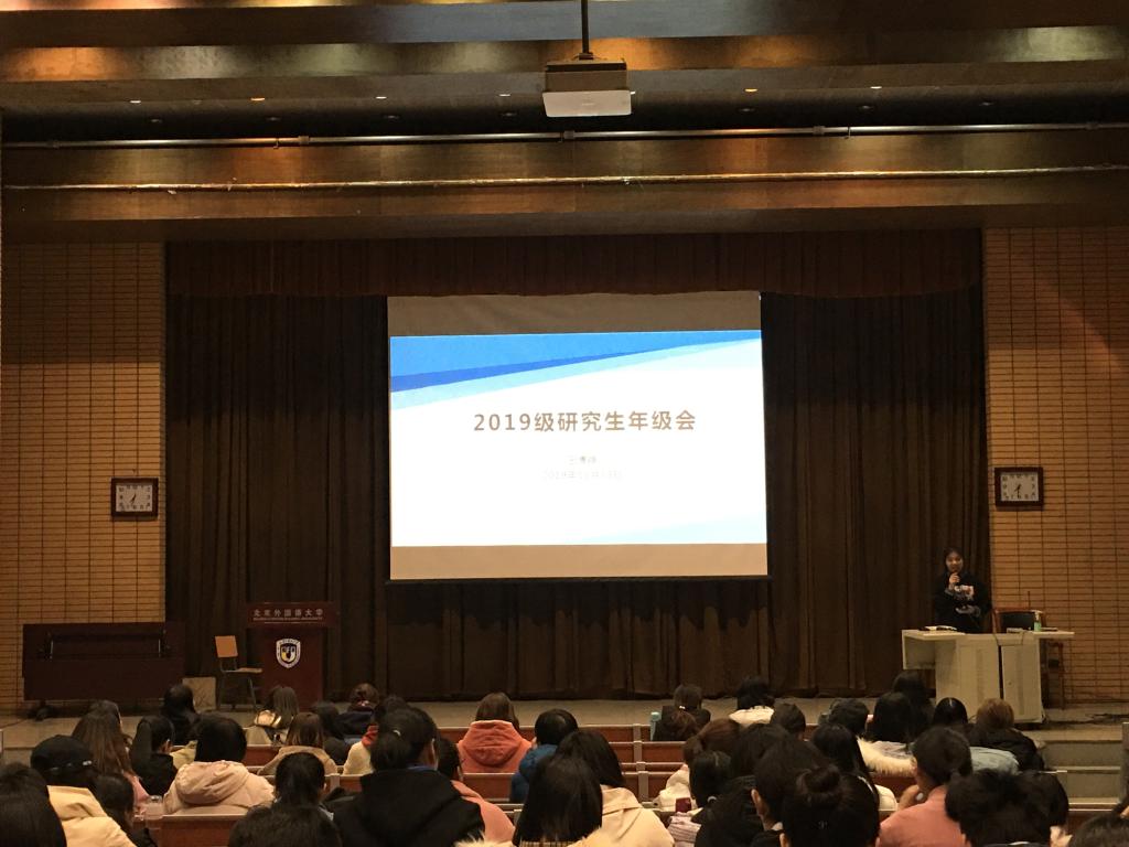 2019级研究生年级会在逸夫楼第三阶梯教室召开,党总支书记路兴、辅导员王博铮及2019级全体研究生出席参加。