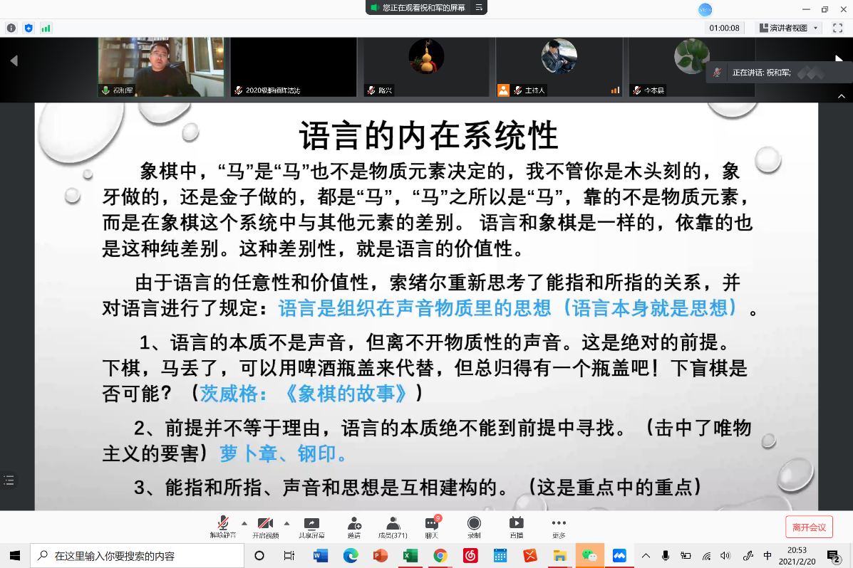 2021年2月20日晚,国产视频 于腾讯会议成功举办“《普通语言学教程》导读”线上讲座。本次讲座邀请到我校马克思主义学院党总支书记祝和军副教授,为同学们解读索绪尔著作《普通语言学教程》,并就语言结构和文化差异和大家展开讨论。