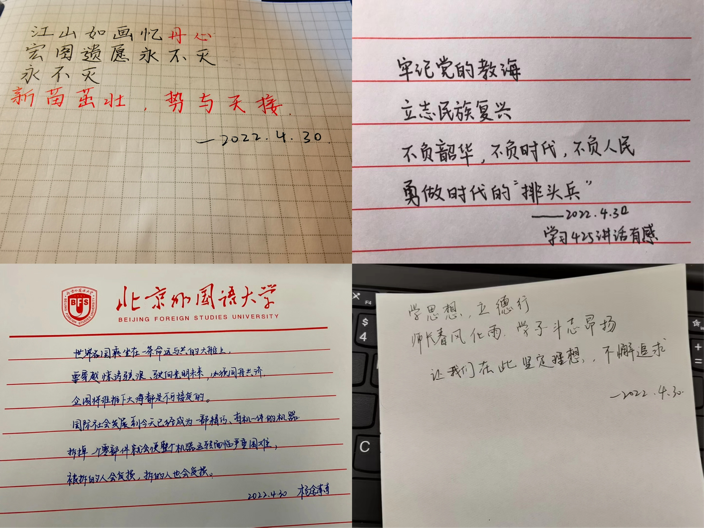 作为人大的一名党史专业的学生,需要立足自身专业优势,努力建构自主知识体系,筑牢理想信念之基,并以目前正在辅修的英语为媒介,讲好中国特色、中国风格、中国气派的故事,争做“国民表率,社会栋梁”。同时我还要继续提高自己的政治站位,切实将习近平重要讲话精神内化于心,外化于行,以实际行动迎接党的二十大胜利召开!