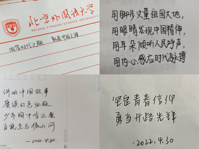 老教授的重要回信精神、习近平总书记在人大考察时的重要讲话精神贯彻落实到四年学习的全过程,充分利用两校优质资源,努力学习专业本领,成长为会讲中国故事、善讲中国故事的新一代青年。她对同学们提出三点要求:第一,牢记自身使命,不负各方期望;第二,心怀大我意识,为民族国家做贡献;第三,扎根中国大地,用好外语,将所学运用到实践中。最后,王明欣预祝大家五四青年节快乐,学习生活一切顺利。