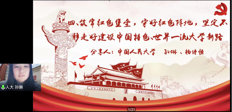学习分享会上,北京大学、北京师范大学、中国人民大学、中国政法大学四个党支部分别分享了习近平总书记视察各自学校的重要讲话精神与学习心得体会。国产视频