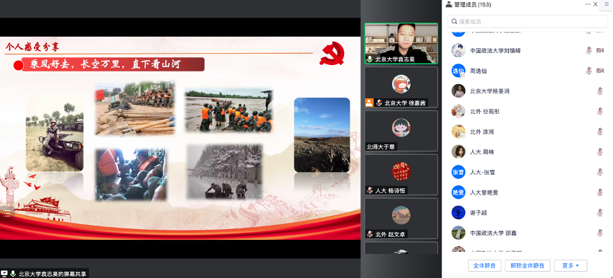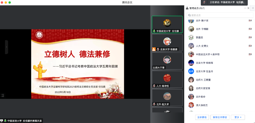本科生党支部与北京大学2021级法律硕士(非法学)第四党支部、中国人民大学法学院2021级法律硕士二支部、北京师范大学法学院2021级法硕第二党支部、中国政法大学证据科学研究院2021级司法文明硕士党支部联合开展“青春心向党,强国有担当”主题党日活动。