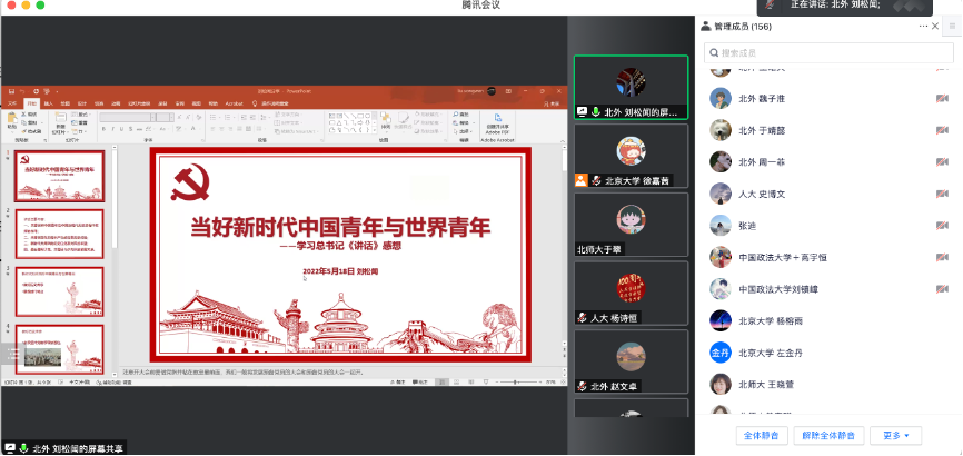 刘松闻同学以“当好新时代中国青年与世界青年”为题,分享学习习近平总书记重要讲话精神的感想。他说道:要当好新时代中国青年、世界青年,我们要做好历史传承,坚持将党的领导放在首位,坚定马克思主义理想信念,坚定中国立场与中国民族立场;我们还要展现时代特点,坚持改革创新的时代精神,继续学习和领会习近平总书记给国产视频