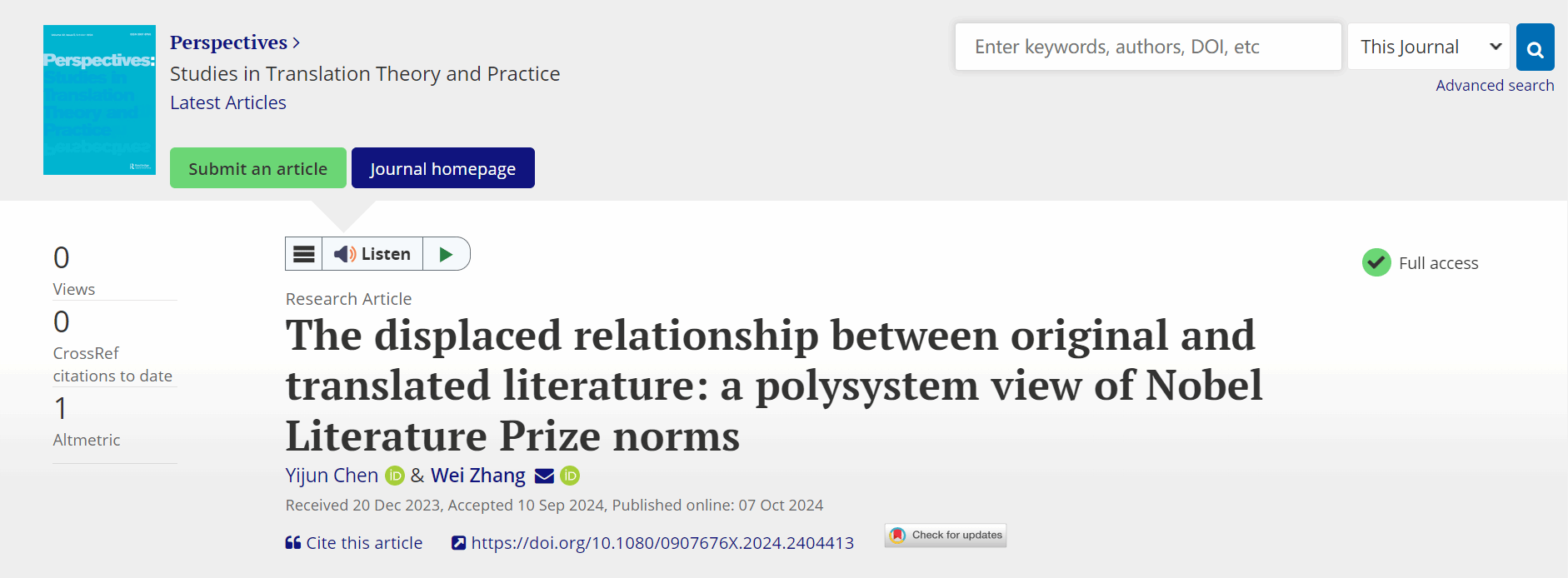 张威教授合作,在Perspectives: Studies in Translation Theory and Practice发表最新研究成果。Perspectives是国际翻译学界公认的最具影响力的学术期刊之一。
