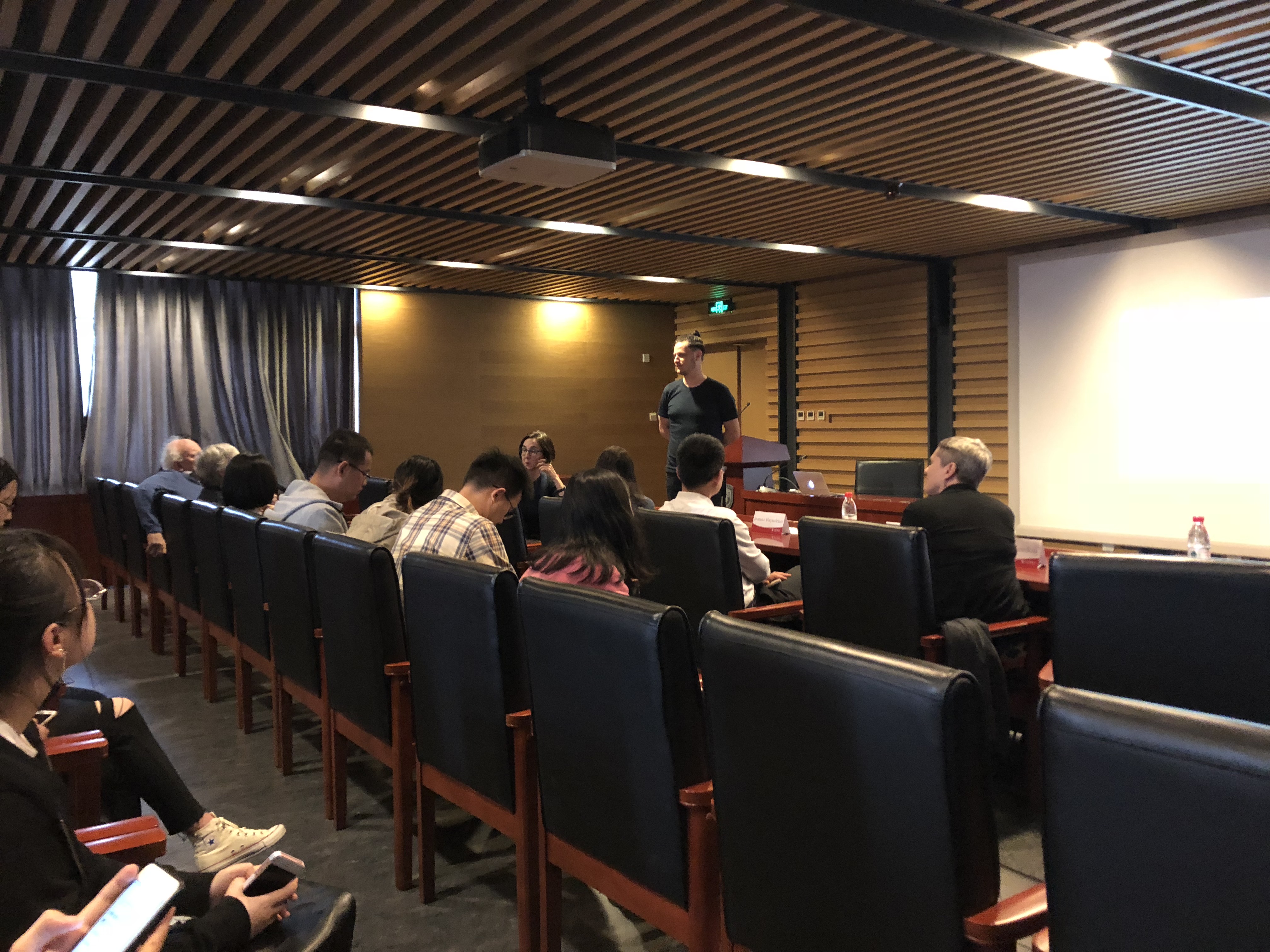 ——两位艺术家讲解结束后,现场的同学和老师进行了积极的提问,问题涉及到分享一些艺术论坛或者艺术设计软件等。史蒂夫和塔玛拉热情地回答了大家的问题,并表示欢迎大家在2018年4月5日去尤伦斯当代艺术中心观看他们艺术团队带来的视听互动装置演出——《变》。