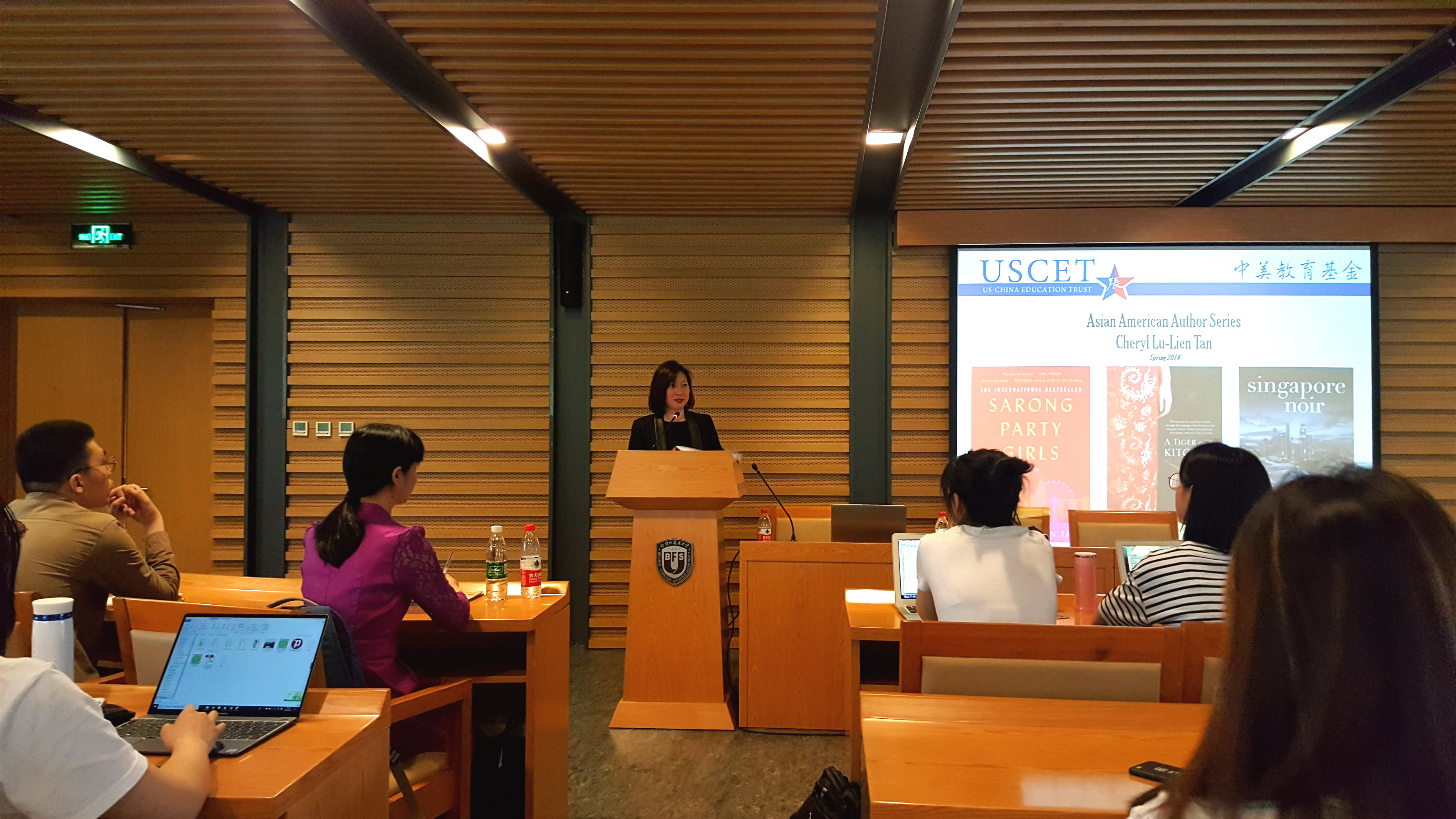 师生做了一场题为“亚裔美国作家作品系列:向世界讲述中国故事”的精彩讲座。生长于新加坡的Cheryl Lu-Lien Tan目前为常驻纽约的记者与作家,她曾为《华尔街日报》等多家著名报社的特约撰稿人,并著有Sarong Party Girls和A Tiger in the Kitchen: A Memoir of Food & Family等畅销书籍。Tan女士主要围绕其第二本书展开演讲。她首先讲述了自己的成长经历,之后结合该书内容分享了关于家人、美食、故乡的回忆与感悟。Tan的风趣幽默的讲述,令现场观众开心不已并引发共鸣。在问答环节,Tan女士就写作技巧、亚裔作家群体情况、华裔身份与新加坡女性地位等方面与现场师生进行了互动。此次讲座由中美教育基金(US-China Education Trust),国产视频