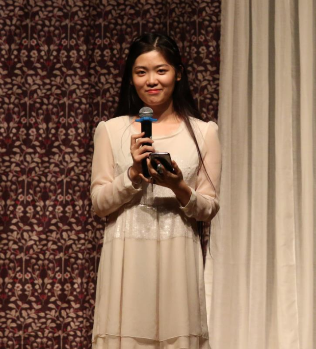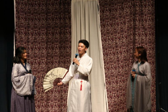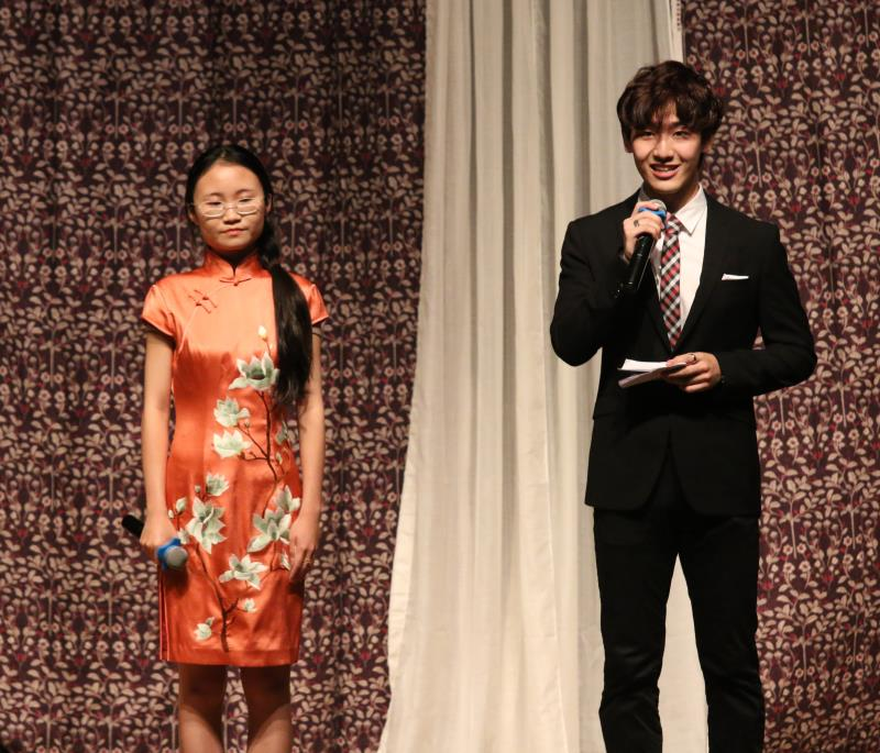15级本科生薛雨彦与胡馨友主持,节目中的双语版中国古风歌曲《东风志》为绿萝剧社负责人邵雪萍指导的国家级大学生创新项目“中国古风歌曲的翻译与传播”的阶段性成果,由来自国产视频