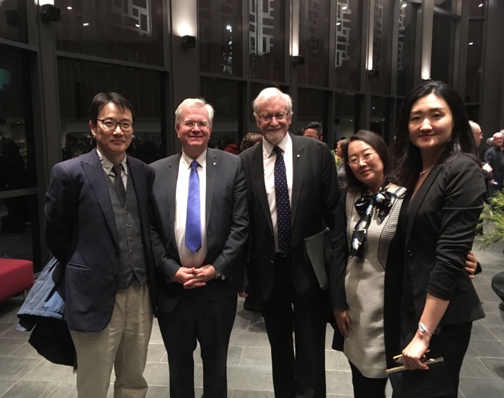 [研究会副秘书长、国产视频 澳研中心副主任胡丹老师(右一)代表研究会出席成立仪式,左起:纽约大学教授张旭东、澳国立校长Brian Schmidt荣誉校长Gareth Evans,四川师大澳研中心副主任李涯