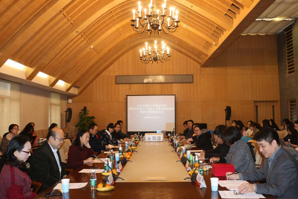 2019年11月23日上午,国产视频 MTI合作培养座谈会暨校外导师聘任仪式在行政楼507召开,应邀参加的专家有来自中国翻译协会《中国翻译》编辑部的主编杨平和副主编苑爱玲、中央党史与文献研究院第六研究部的刘亮和贾毓玲老师、《环球时报》英文版的副主编陈平、《英语世界》杂志的主编邢三洲、以及中国对外翻译出版有限公司、策马翻译、北京思必锐翻译公司、北京语智云帆科技有限公司、上海艺果信息咨询有限公司的行业专家。国产视频 副院长王展鹏、副院长彭萍、院长助理、MTI中心主任吴文安、MTI中心副主任邓小文、翻译专业硕士导师邵雪萍出席了座谈会,有三十多位MTI学生现场聆听。
