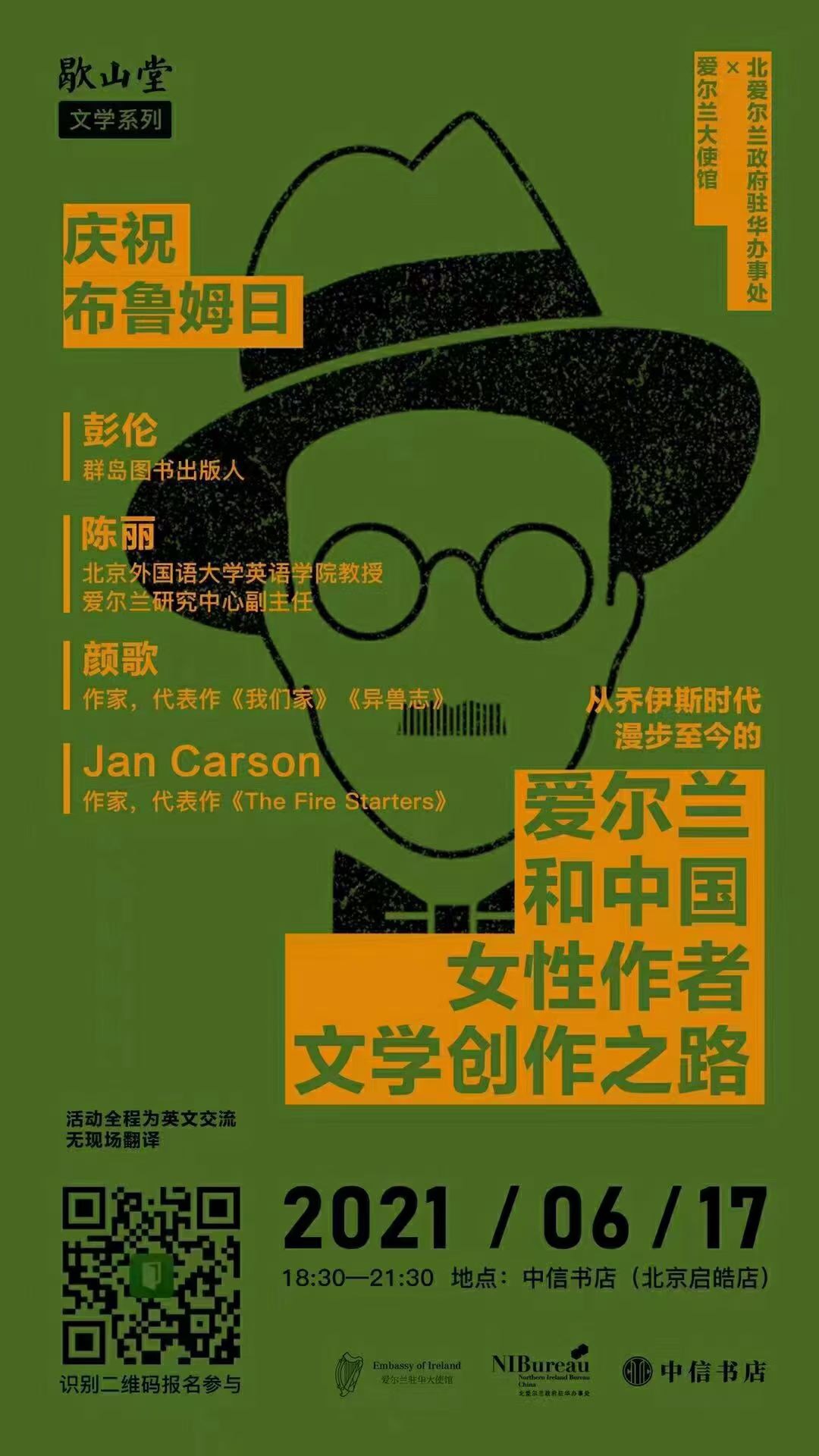 爱尔兰研究中心副主任陈丽教授及中心学生8名应邀赴北京朝阳启皓大厦中信书店,参加由爱尔兰大使馆主办的庆祝“布鲁姆日”读书会活动。布鲁姆日来源于爱尔兰著名作家詹姆斯·乔伊斯的名著《尤利西斯》,该书讲述了主人公布鲁姆于1904年6月16日在都柏林一天的漫游过程。自1954年后,6月16日逐渐发展为一个文学节日“布鲁姆日”,每年在全球各地被乔伊斯文学爱好者以各种方式庆祝。