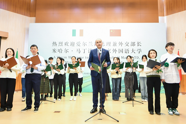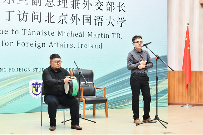 爱尔兰语师生用汉语、英语、爱尔兰语三语朗诵了爱尔兰诗人叶芝的著名诗歌《当你老了》,马丁受邀上台参与爱尔兰语朗诵,现场气氛热烈。