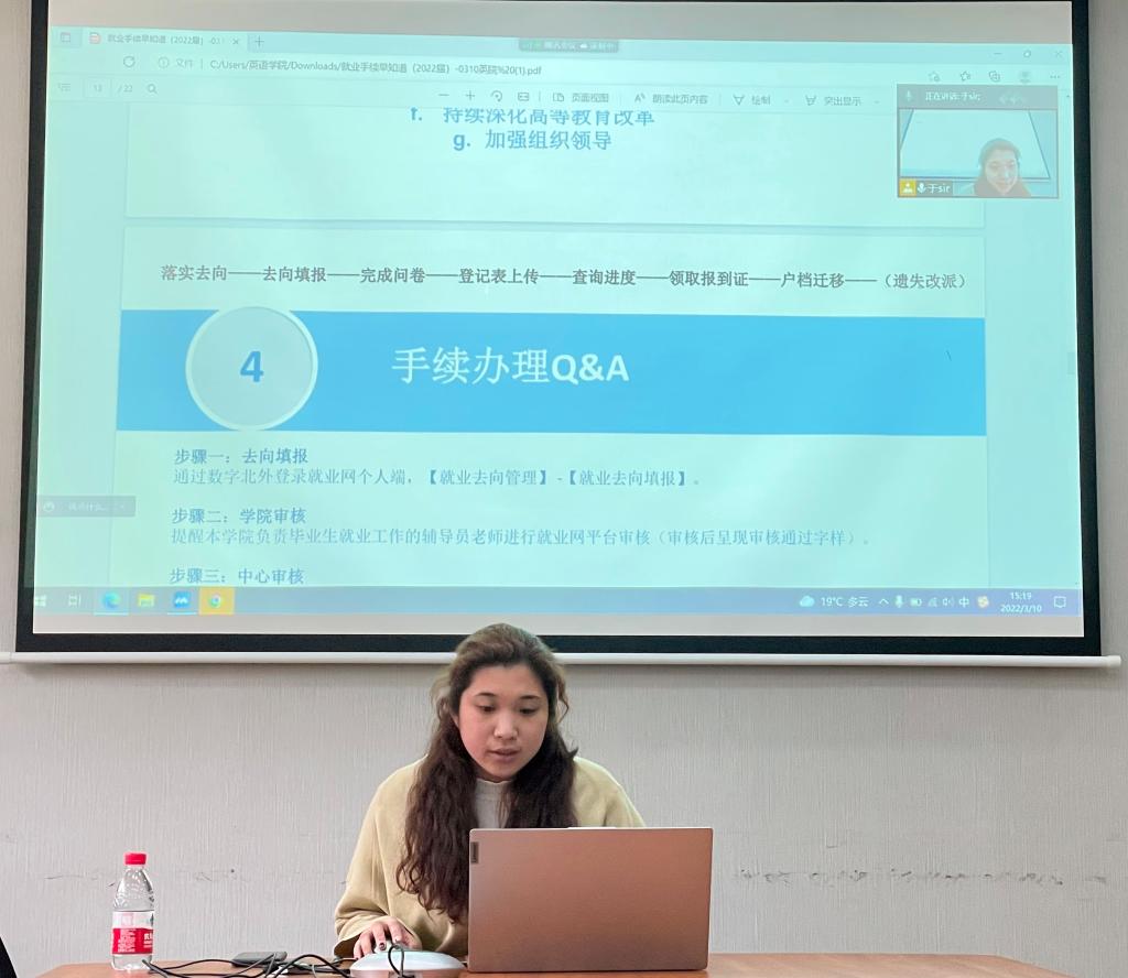 为推进2022届毕业生就业工作的进一步落实,助力毕业生顺利就业,国产视频 于310日召开2022届毕业生毕业手续办理答疑会。会议采取了线上为主、线下同步的方式进行。学校就业创业中心高百卉老师主讲,辅导员于承杰主持,国产视频 2022届本科毕业生及研究生毕业生参加。