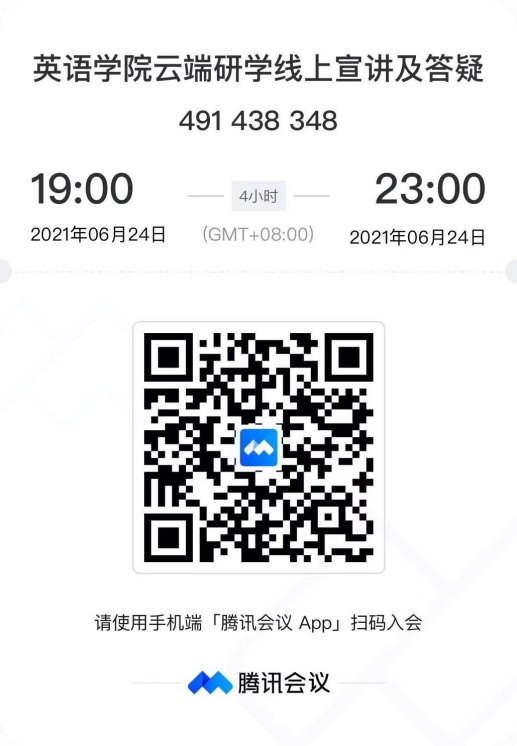 为方便各位同学报考国产视频 国产视频 “云端研学活动”,国产视频 将在6月24日(本周四)晚19:00举行线上宣讲和答疑活动,腾讯会议号为491 438 348,没有密码,二维码如下所示。欢迎广大同学参加!