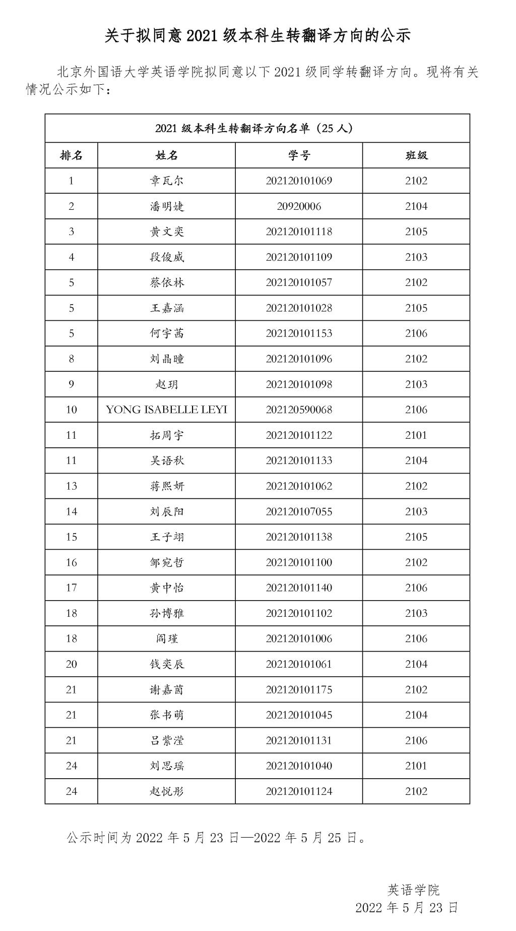 关于拟同意2021级本科生转翻译方向的公示
